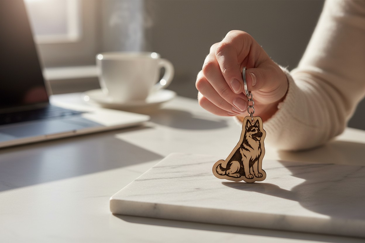 Porte-clés en peuplier Berger allemand. Boréo s’est donné pour mission de sublimer vos clés, et fabrique ces porte-clés dans son atelier Strasbourgeois.